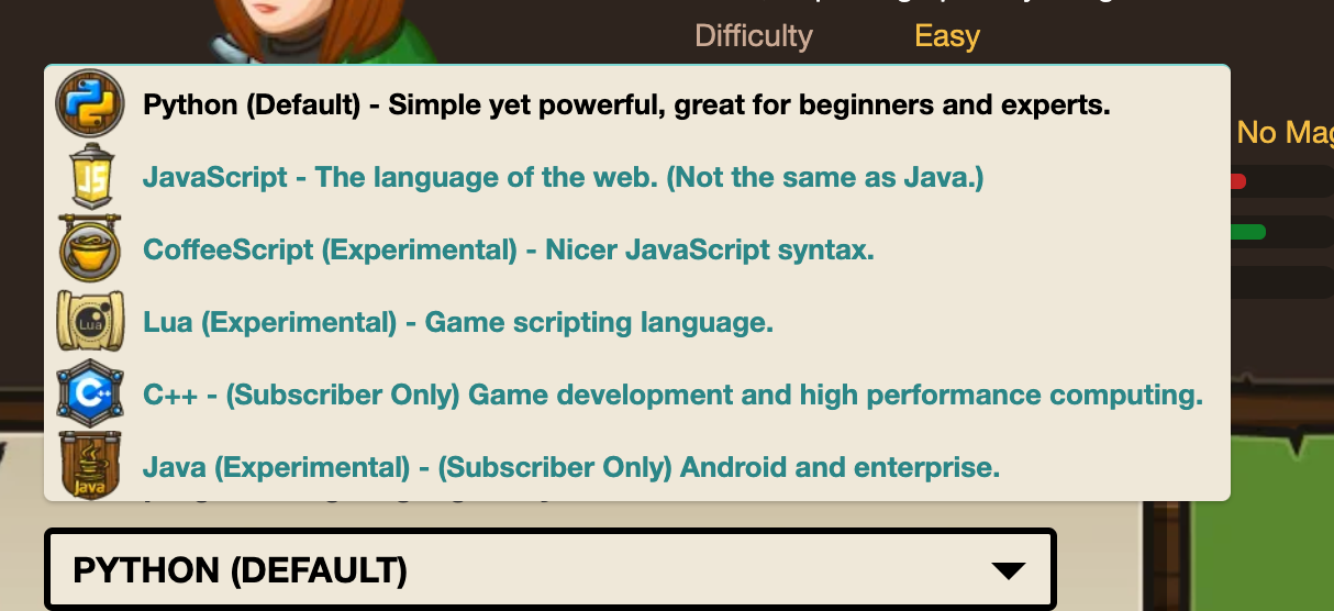 Le permite elegir con qué lenguaje de programación comenzar y avanzar a través de los juegos.