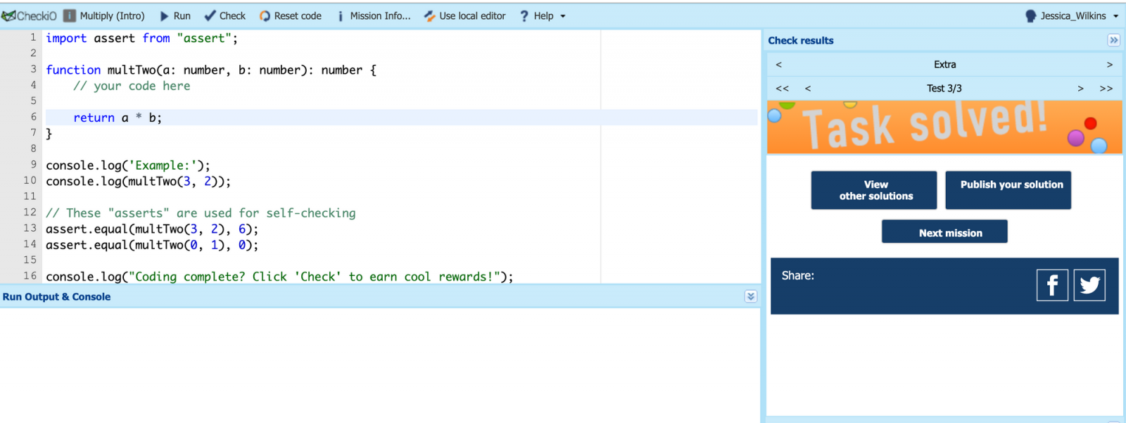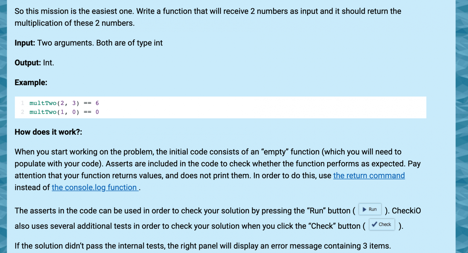 CheckiO es un juego de estrategia en el que se puede aprender TypeScript o Python a través de una serie de desafíos. Una vez que cree una cuenta gratuita, comenzará con las pruebas para principiantes y avanzará hasta los de un experto.