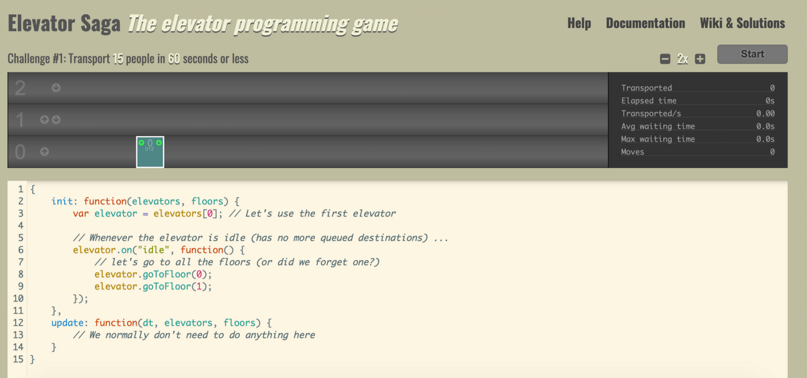 Elevator Saga es un juego de JavaScript en el que atravesará una serie de desafíos tratando de transportar personas en ascensores de la manera más eficiente posible dentro del tiempo asignado.