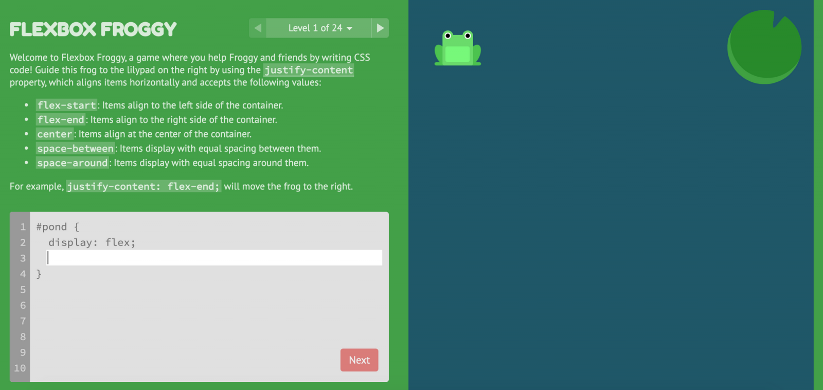 En Flexbox Froggy aprenderás CSS Flexbox colocando las ranas en los nenúfares correctos. Para cuando termine el nivel 24, debería sentirse cómodo usando Flexbox.