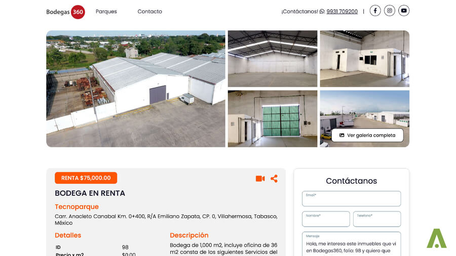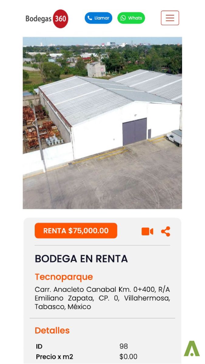 Esta sección es la más importante de toda la web porque detalla las características de la bodega, ayudando a los clientes a identificar rápidamente si es apta o no para su negocio.