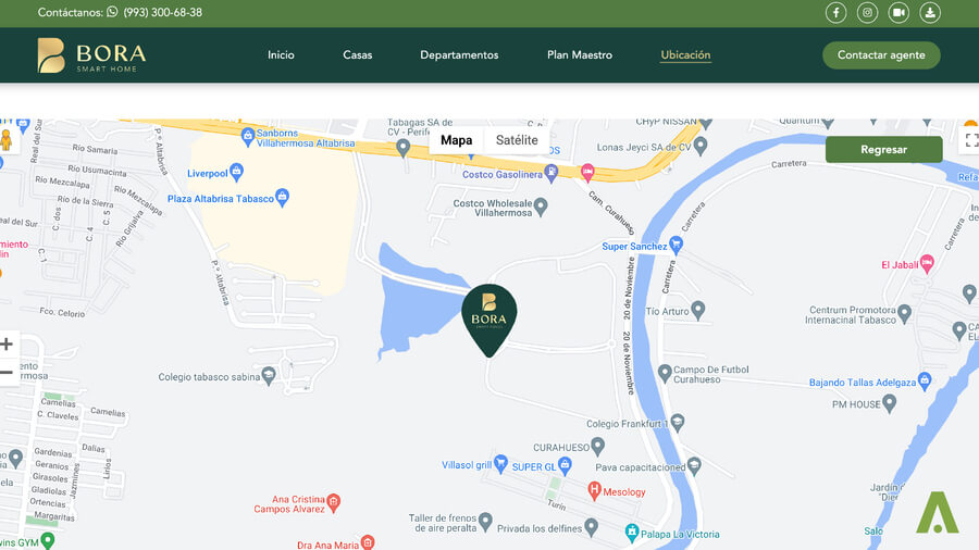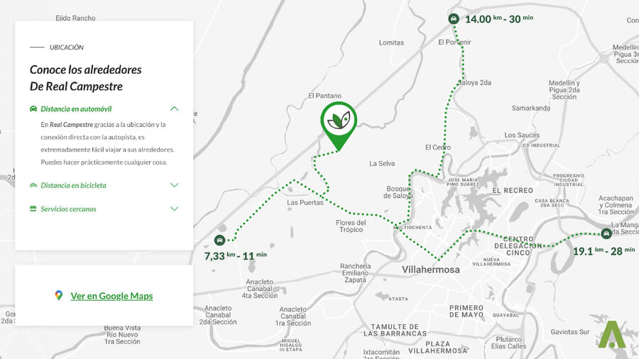 Una de las secciones más importantes es la de ubicación, porque podemos medir la distancia y el tiempo de puntos importantes con referencia al fraccionamiento. Eso es fantástico porque ayuda al lead (prospecto de cliente) a darse una idea de cuánto tiempo tardaría en llegar a ciertos puntos principales de la ciudad