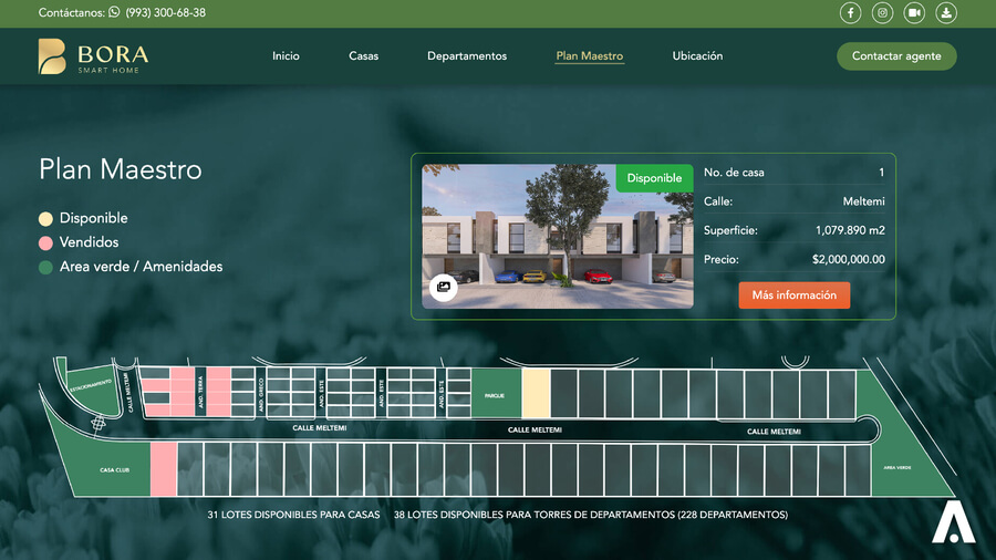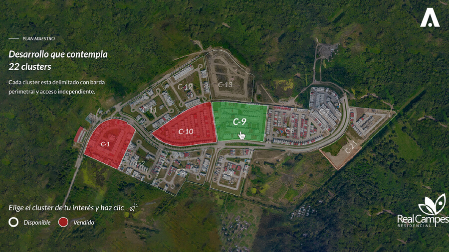 Esta es la Joya de la corona, un plan maestro para cotizar lotes y casas, con una vista cenital, generando una experiencia extraordinaria y única para el usuario. Aquí podemos ver que está disponible y vendido, además de ver los modelos de casas o lotes específicos de cada cluster. Y lo más importante es que podemos cotizar y generar una hoja de financiamiento ¿Increíble cierto?