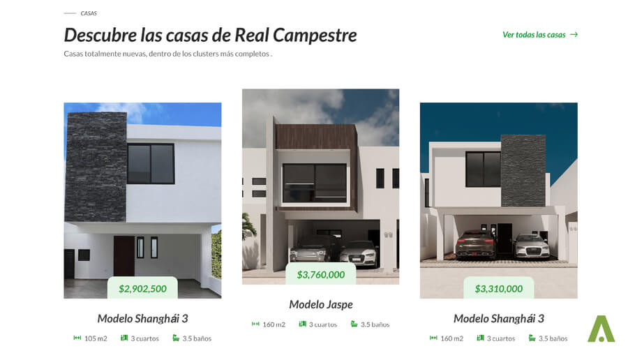 En el website de RC podemos encontrar una sección exclusiva para casas, donde se muestra el precio, metros cuadrados de construcción y otros datos importantes que un cliente necesita saber, esto ayuda a la rapidez de la información y no esperar a que nos manden propuestas por correo.
