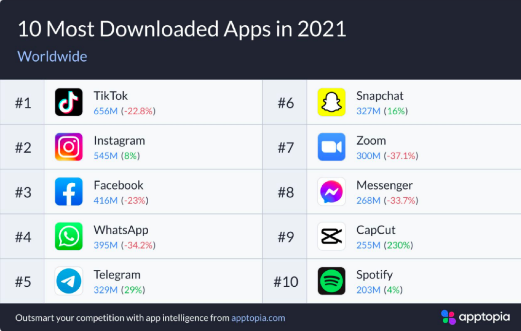 Apptopia, una empresa de análisis, publicó su ranking anual de descargas de aplicaciones para cerrar el año y estas son las cifras que las distintas aplicaciones consiguieron a lo largo del 2021.