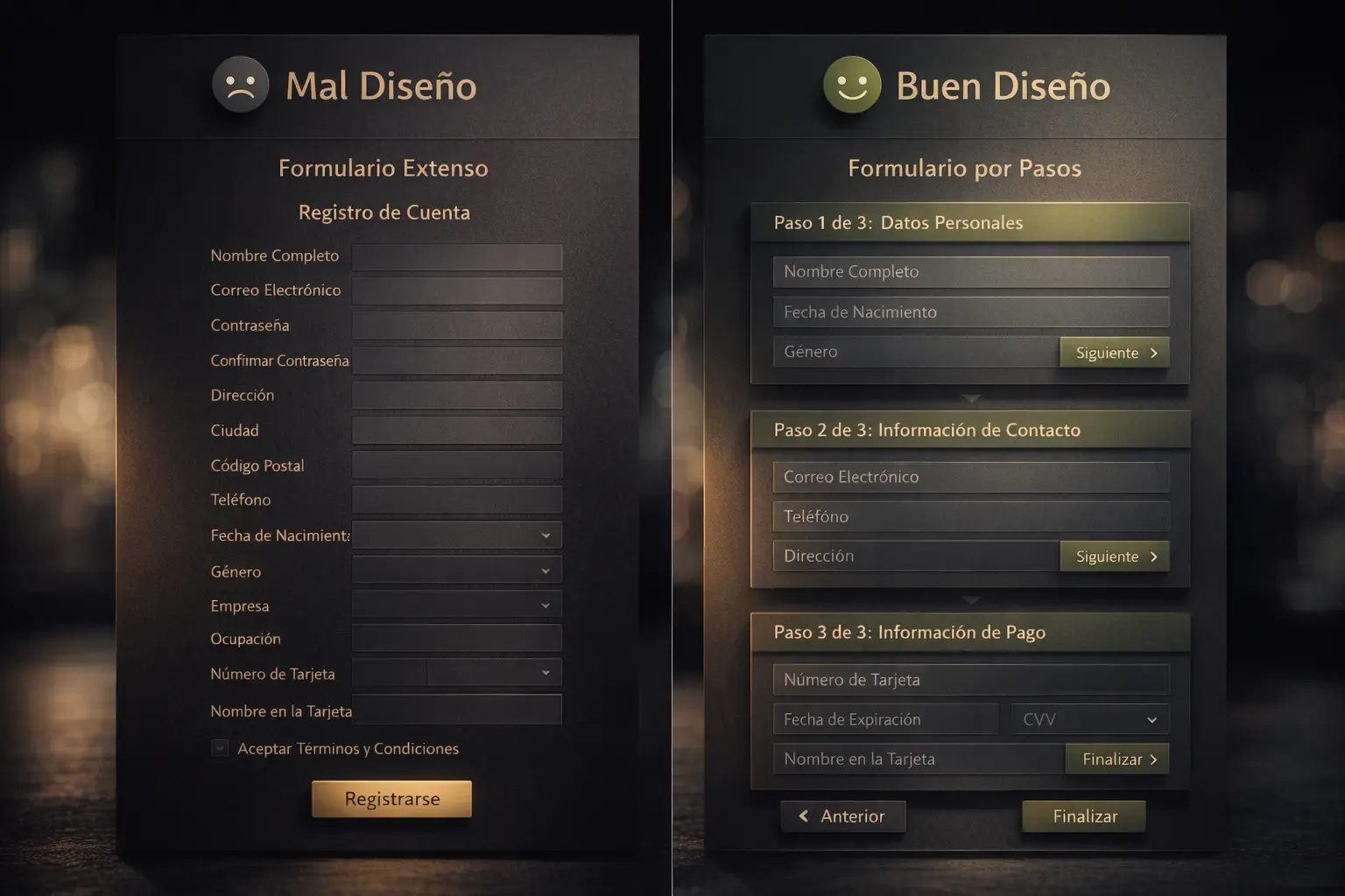 ❌ Mal diseño: Un formulario con 20 campos en una sola pantalla.