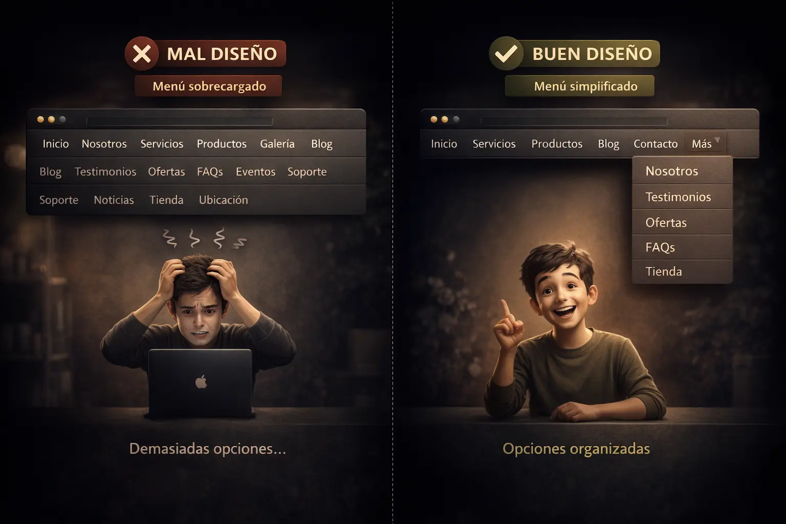 ❌ Mal diseño: Un menú con 15 opciones visibles al mismo tiempo.