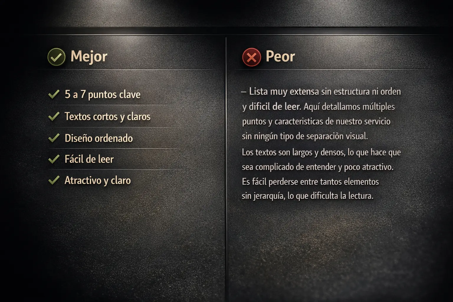 - Textos largos sin separación visual